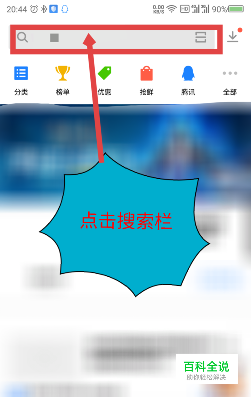 打开应用商店软件后,和其他应用商店一样,点击最上面的搜索框。如图所示