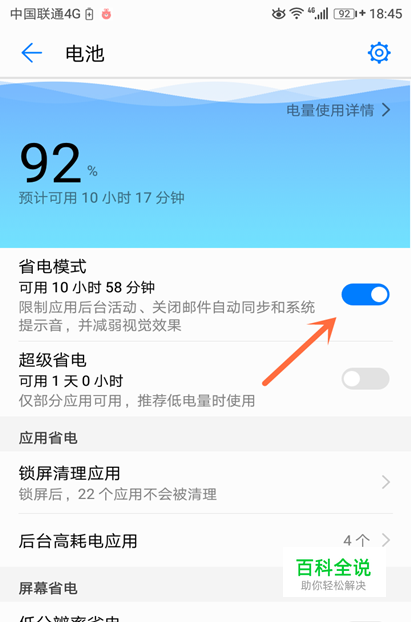 5.第五步,将“ 省电模式”右侧的“ 开关”点击打开,就成功设置了。