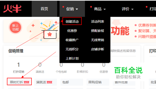 在火牛首页【促销管理】栏找到【显示折扣】,点击进入活动设置页面;或者在首页导航栏【促销】里面点击【创建活动】按钮,进入活动选择页面。在页面找到【限时折扣】选项,鼠标经过可以预览活动效果,确认创建以后,点击【点击创建】按钮进入活动创建页面。