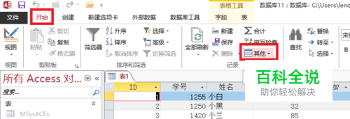 首先,打开access数据库2013,再打开你的表格。点击上面的【开始】,选择记录选项组里的【其他】。