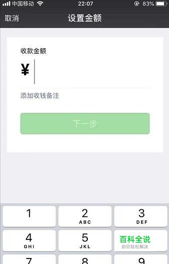 点击进入设置金额页面,输入收款金额后点击下一步,如下图
