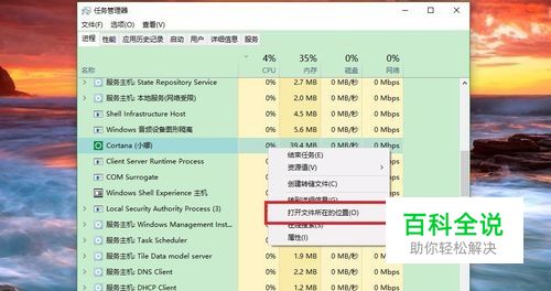 进入正题,“Ctrl+Shift+Esc”打开任务管理器,找到Cortana小娜进程,右键“打开文件所在的位置”;