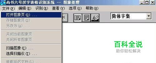 一、文字识别软件的选择 本文,推荐大家使用尚书六号汉字表格识别系统这个软件。请到网上下载一个并安装,这样,就可以使用了。 二、文字识别软件使用方法 该软件的界面如下图。当然了,如果您想提取图片中的文字,那么,必须要有图片。或者,通过扫描仪将书面材料扫描成为电脑图片,这样,就可以提取了。 之后,如下图一样,执行菜单操作“文件”→“打开图象页”。