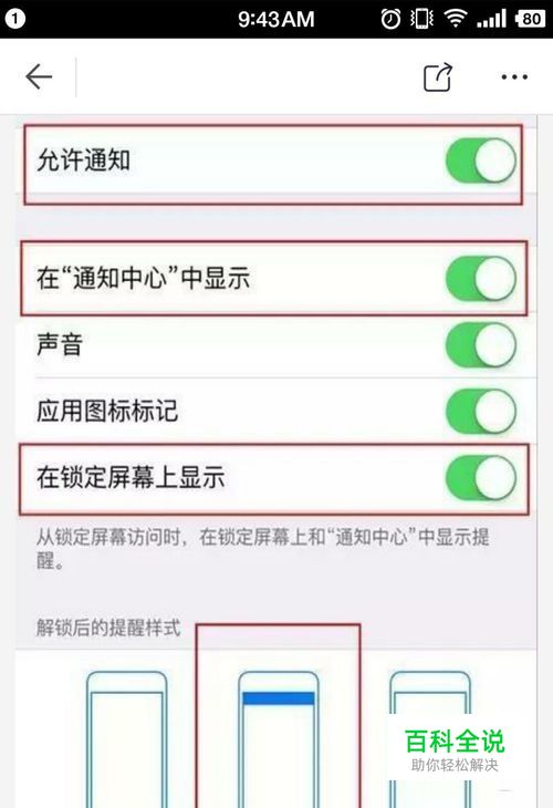 设置好步骤1之后,回到手机桌面,找到手机的【设置】-【通知】,点击进入【通知】,找到并点击微信图标,在弹出的窗口中将【允许通知】、【在“通知中心”中显示】和【在锁定屏幕上显示】这三个选项都打开,并在底下的“解锁后的提醒样式”下选择【横幅】。