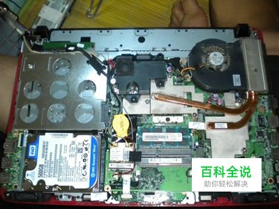 笔记本的底壳拿下来之后,就能够看见笔记本的多数配件了。左下角是硬盘,硬盘上面是光驱,光驱旁边是喇叭,喇叭旁边就是笔记本的风扇了。