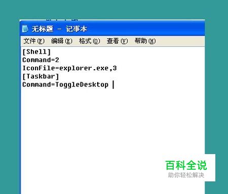 第一步:新建一个文本文档,在里面输入 [Shell] Command=2 IconFile=explorer.exe,3 [Taskbar] Command=ToggleDesktop 。
