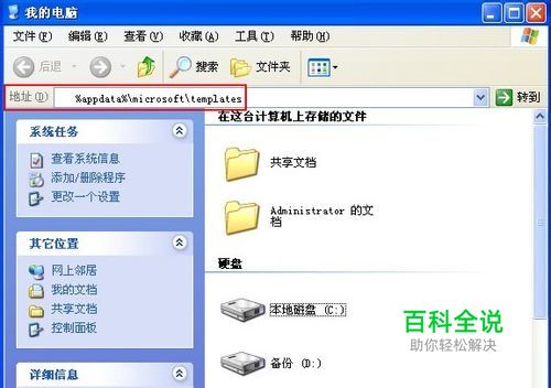 打开“我的电脑”在地址栏输入“%appdata%\microsoft\templates”不包括引号,按回车键。