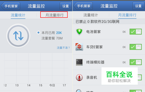 进入【月流量排行】查看一下,可以看到所有软件的2G/3G联网的使用情况及排行。