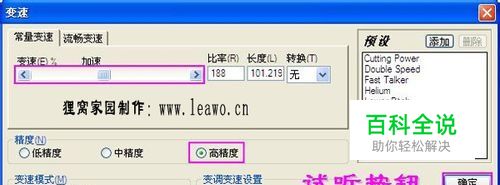 导入素材后,用鼠标把音乐素材拖拽到右边的编辑轨道上面,或者直接双击素材。选择效果 — 时间和间距 — 变速(进程),弹出了变速的对话框。先看常量变速,点击变速(E)%左右的按钮可调节变速的效果,在下面有很多的选项供大家选择,变速模式下面有变速不变调等,旁边还有变调变速设置,右上角是一些高音,重低音等的选项,这些选项大家可以通过点击右下角的试听按钮来选择自己喜欢的效果,还有大家记得把精度选择为高精度哦。