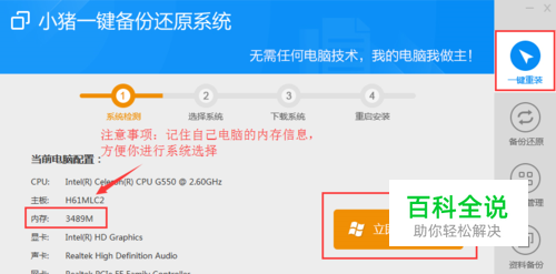 点击右侧菜单中的“一键重装”,然后软件的主界面很快就会显示出你电脑硬件的信息。记住内存大小之后,我们就可以点击“立即重装系统”按钮了。