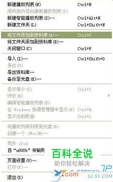 媒体导入 iTunes是个媒体管理器,在下面进行相应的同步过程中,媒体要事先加入到iTunes里面去。加入的方法是在文件菜单选择“将文件添加到资料库”或者“导入”,如下图所示: