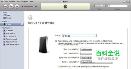 设置iPhone名字 这只有在第一次连接iPhone才会出现,如下屏幕: 输入iPhone的名字,屏幕上有几个选项,分别表示了怎样同步以及与哪些数据同步,选好后点完成,进入汇总屏幕。