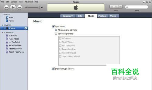 音乐(Music)屏幕 iPhone音乐影音同步截图 勾上Sync Music就表示需要同步音乐。iTunes以播放列表的方式与iPhone同步,只有建立播放列表才能同步到iPhone上。默认同步所有列表,如果只想同步部分列表,选择Selected playlists,然后勾上需要同步的列表。Include Music Videos表示同步是否要包括MTV。选好后点击Apply或Sync开始同步。要从iPhone删除音乐的话,需要在iTunes播放列表里删除,然后与iPhone同步。