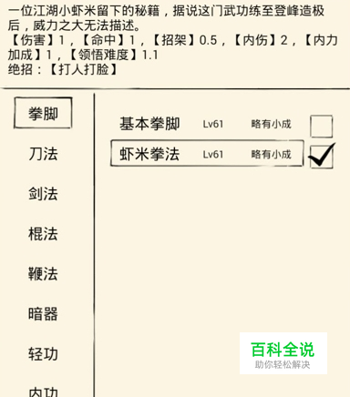 虾米拳法:基础拳脚20级,找小宝触发进行学习。