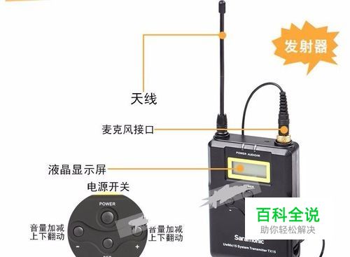 如图所示 发射器—麦克风显示; 显示电池剩余量; 显示当前频道和频率;