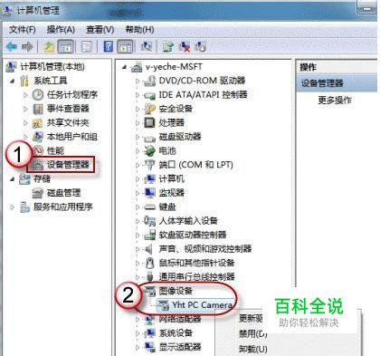 在“电脑管理”窗口左边一栏,双击“设备管理器”。然后,从右边栏中找到“图像设备”,点开。在摄像头设备上右键鼠标,选择“属性”。