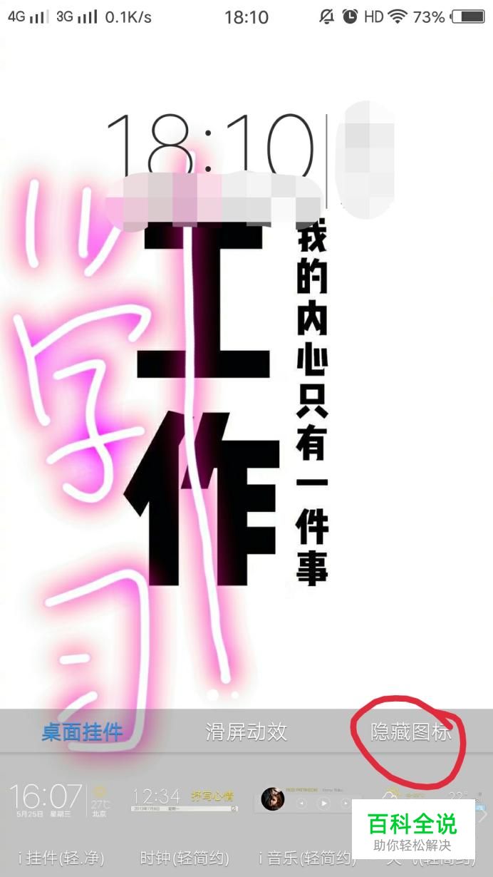 打开手机,长按屏幕,出现以下界面,找到右下角的“隐藏图标”。