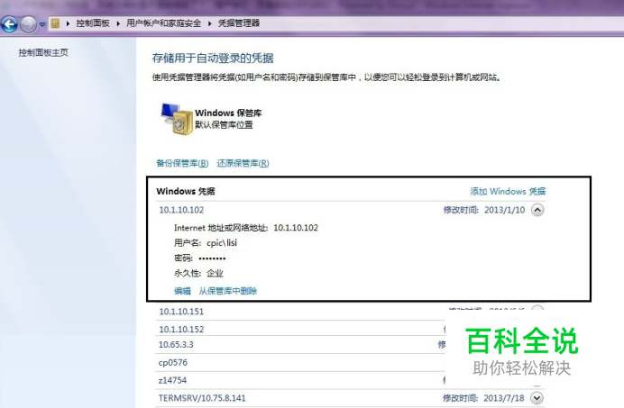 在实际工作中,经常需要访问局域网内其他机子上的共享文件夹,例如\\192.168.1.100\d$ , 首次访问时,需要输入用户名和密码才可以进入,即使没有勾选”保存密码”选项,下次登录时也会直接进入,虽然这个功能方便实用,但是当需要切换到另外一个账号时,就不知所措了。 那么:如何才能清除本机Windows环境下访问这些共享文件夹时的登录信息(用户名和密码)呢? 下面给大家介绍一下。 一、命令行(cmd窗口)操作 当在命令提示窗口输入net use命令时,会显示本机缓存的共享登录信息,如果你想切换用户,则可以删除那条缓存的记录即可。 举个例子,如上图显示,假设IP地址是192.168.10.100,则使用net use \\192.168.10.100 /delete即可,如果要删除多条缓存或全部缓存则要使用net use * /delete,这个命令会提示确认信息在删除每条记录之前,因此当进行到你想要删除的记录时按Y回车即可。 当完成上述命令后,再重新登录时就会提示输入用户名和密码啦。 二、图形界面操作 使用操作系统删除已存储的共享文件夹登录信息,相对来说更加直观,具体操作如下 1.在Windows XP系统 在Windows XP下,控制面板->用户帐户,选择当前使用的用户,例如,如果当前用户是Administrator,则在用户帐户窗口里选择Administrator,进入下图所示窗口,点击“管理我的网络密码”,在弹出的“存储用户名和密码”的窗口里,选中要删除的项,点击右侧的[删除]按钮即可。 2.在Windows Server 2003 在WindowsServer 2003 中,控制面板->存储的用户名和密码,点击修改或删除即可,如图所示 3.在Windows 7 在Windows7下,控制面板->用户帐户和家庭安全->凭据管理器,即可看到如下图所示的登录信息管理页面,删除或编辑某一个登录信息即可。 当完成上述命令后,再重新登录时就会提示输入用户名和密码啦.