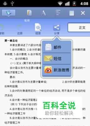 文档分享 文档分享是4.2版本的新增亮点功能,不管是文字内容,还是文档截图、附件等,都可以随时随地通过新浪微博、短信和邮件的方式分享及发送出去。