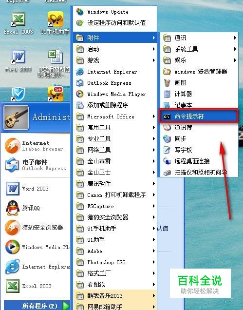 我们首先打开开始菜单,选附件-命令提示符。