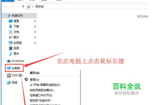 在回收站/任意会文件夹的左侧 找到“此电脑”,然后在其上面点击鼠标右键---点击"属性"。