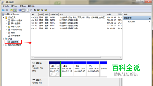 在计算机管理界面中点击“磁盘管理”,右侧弹出磁盘管理界面。