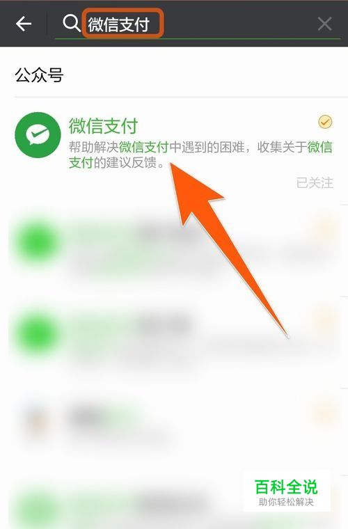 现在,在上方放大镜旁边的搜索框内输入“微信支付”,然后就会得到一个“微信支付”的公众号,点击它