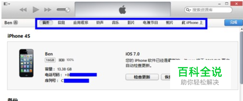 随后即可进入 iPhone 的管理界面,上面顶部一排是管理内容分类,如摘要,信息,应用程序,铃声等。然后请点击应用程序,如图所示