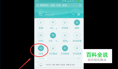 . 首先,我们在手机的开关状态栏里找到,‘快传 ’功能按钮,点击打开快传功能 。 .