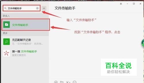 方法1、通过“文件传输助手” 首先在电脑版微信的“搜索”框内输入“文件传输助手”,点击选中“文件传输助手”程序,将需要发送的目标文件拖入到“信息发送对话框”,点击发送,就可以在自己手机上查看及收藏该文件了。