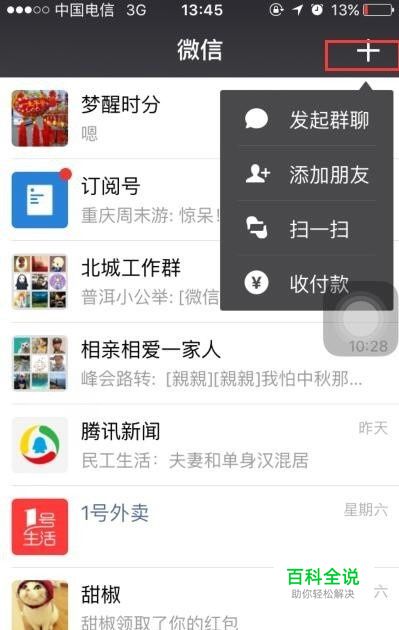 打开微信,点击右上角的+号。