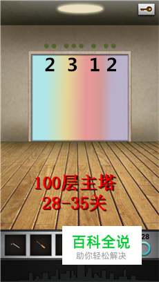 第28关 按照数字点击模块 第28关一开始只有乱点点,发现此关的大门是4种颜色。然后发现最上方有小圆点,而且也是分为4块,这很容易联想到二者的关系。 方法,按照2-3-1-2次数依次点击4个方块。