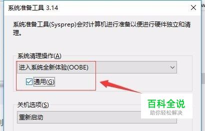 在出现的窗口,单击“系统清理操作”下拉列表框,选择“进入系统全新体验(OOBE)”,同时选中下方的“通用”复选框,再选择“关机选项”为“重新启动”,单击“确定”按钮即可;如图所示: