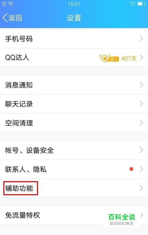 首先打开手机QQ的辅助功能:打开并登录手机QQ,点击左上角个人QQ头像——在弹出的下拉列表中选择“设置".——点击辅助功能