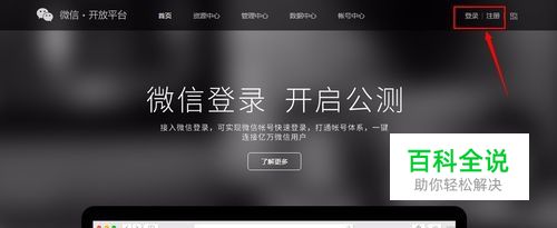 首先需要有一个微信开放平台的账号,如果已经有了,可以直接登录。注册账号点击如图所框选位置。
