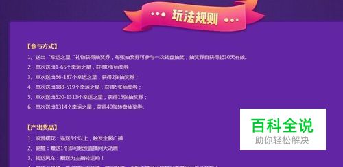 参与方式: 1、送出“幸运之星“礼物获得抽奖券,每张抽奖券可参与一次转盘抽奖,抽奖券自获得起30天有效。 2、单次送出1-65个幸运之星,获得0张抽奖券 3、单次送出66-187个幸运之星,获得2张抽奖券; 4、单次送出188-519个幸运之星,获得5张抽奖券; 5、单次送出520-1313个幸运之星,获得15张抽奖券; 6、单次送出1314个幸运之星,获得40张转盘抽奖券。