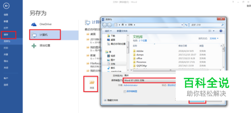接下来最关键的一步,点击文件——保存——点击计算机——点击浏览,选择保存的路径——输入文件名——保存类型:Word97-2003文档(关键),这就保存为兼容模式,旧版也可以打开。
