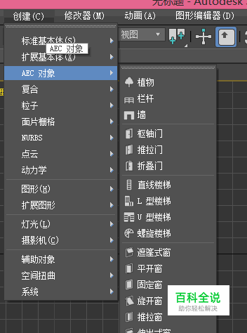 从最上面的主菜单栏中来找到创建选项,打开创建选项以后我们也就可以看到AEC对象功能,鼠标移动到AEC对象上就可以看到,3种门的类型供我们选择,如图