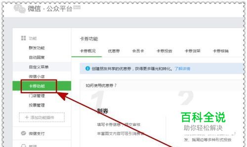 公众号管理登陆微信帐号后,在菜单左侧找到“卡券功能”按钮,点击打开进入下步操作,如下图示。