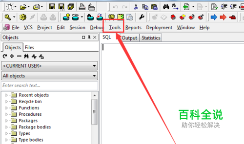 首先登录到数据库中,通过PLSQL工具等到到数据库,然后点击右上角有个工具栏,然后点击工具栏上的tools。工具栏上的tools(工具)