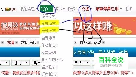 首先登入晋江网站。 在用户名后面会出现“写作”按钮,鼠标移动到按钮上会出现下拉菜单。 如果需要发表文章,单击”发表新文“。