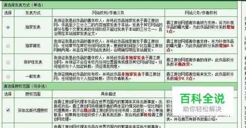 填好作品相关信息,选择,提交。 我默认选择”添加文章“。 出现文章授权界面,具体可以看界面讲解.提交完成。 ps:根据网上所说,这个授权信息如果需要变更,后期可以联系客服(或者后台?)更改。 pps:选择发表方式以及授权方式后,在"确认”按钮旁会出现“最终积分系数”的字样,这个是自动算出的,积分的具体作用可以在网上搜索到。