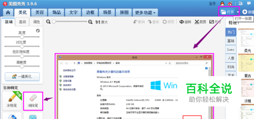 点击软件界面右上角的 ‘打开’按钮,在弹出的对话框 找到并选中这张图片,鼠标左键单击对话框的 ‘打开’。打开图片后点击左侧的 消除笔。