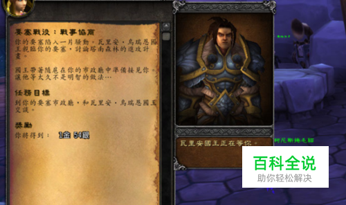 升级6.2完成后,进入要塞会自动跳出要塞任务:战事协商,要求主角去要塞市政厅找乌瑞恩国王聊天。