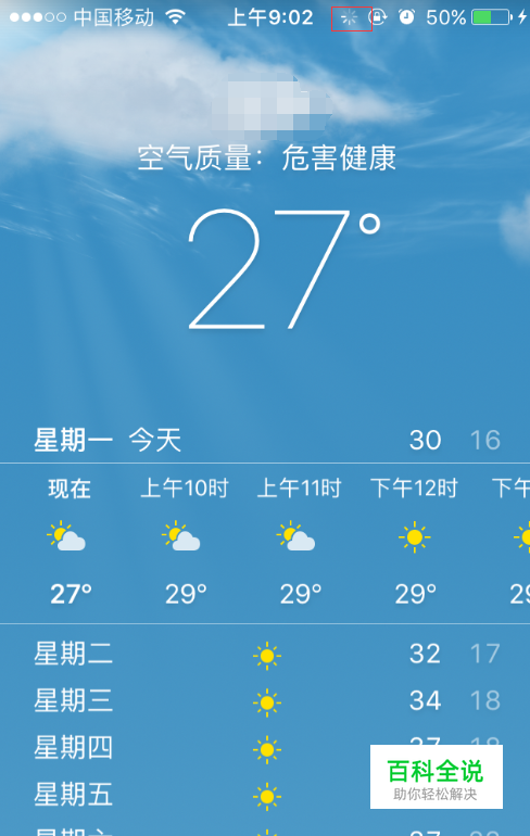 准备一台苹果手机,并解锁手机我们打开天气看一下,发现上方一直在转圈,这说明是更新不成功的表现。