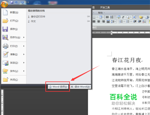 首先,点击左上角菜单,在显示的小窗口中点击“word选项”。