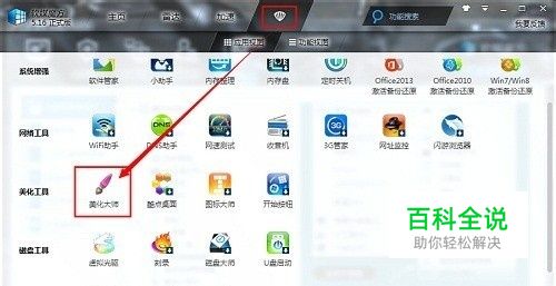 首先需要安装一个软媒魔方,打开运行魔方。在“功能大全”菜单-“美化工具”选项卡-选择“美化大师”选项;