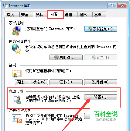 同样的,找到Internet属性对话框中的内容选项卡,点击“自动完成”中的设置。