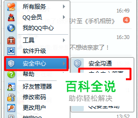 点击QQ主面板中的“主菜单”按钮,从弹出的扩展菜单中选择“安全中心”->“安全中心首页”项进入。