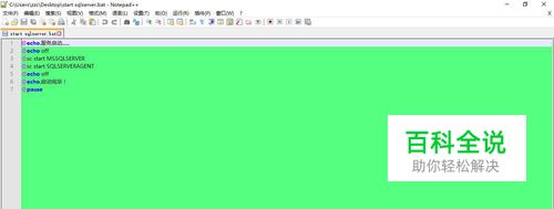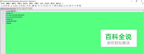 在一个文本文件中添加启动或者停止SQL Server服务的批处理命令,这里用的是server control命令。添加完批处理命令后,将文件保存为.bat文件。其中,sc start和sc stop后面的内容就是服务的名称。